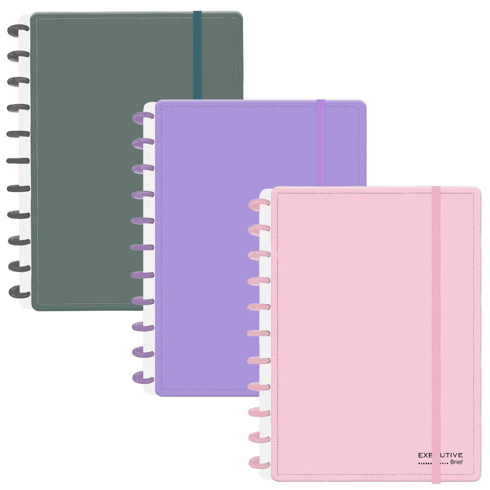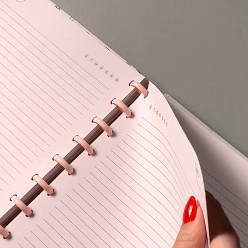 Um caderno versátil com discos, folhas, elásticos e capas, pensado para unir praticidade, estilo e funcionalidade.